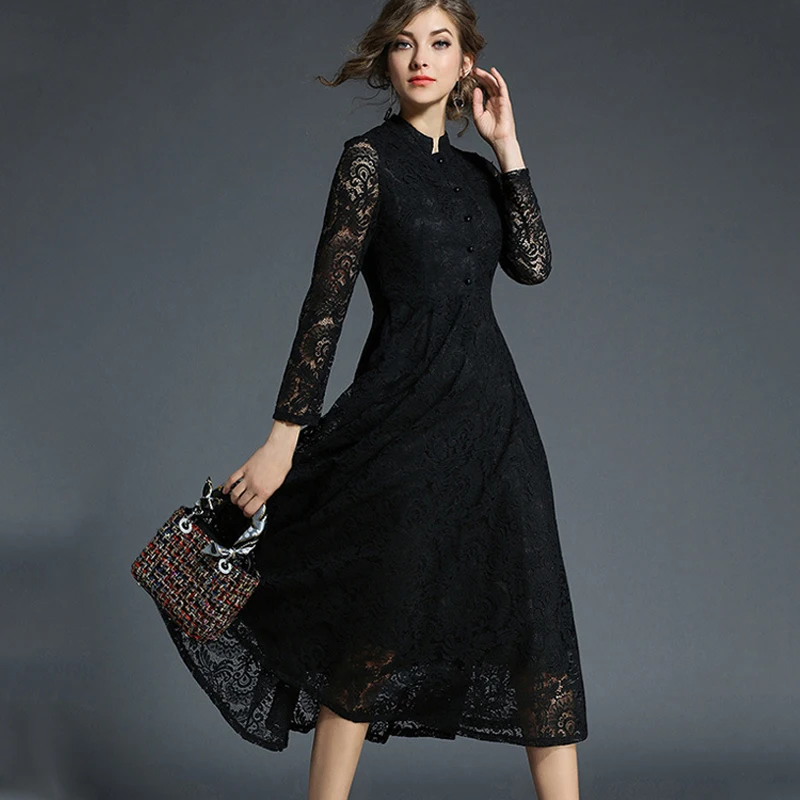 SALE Spring Autumn Lace Long Dress Women Stand Neck Long Sleeve Plus Size 5xl Slim Office Work Dress Fem